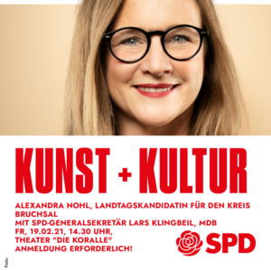Die SPD-Landtagskandidatin Alexandra Nohl wird am kommenden Freitag, 19. Februar, um 14.30 Uhr den Generalsekretär der Bundes-SPD, Lars Klingbeil, MdB, zur ersten Präsenzveranstaltung unter strengen Hygienevorschriften im Theater "Die Koralle", Eggerten 47 in Bruchsal begrüßen. Die beiden SPD-Politiker*in werden zum Thema "Starkes Baden-Württemberg - Vielfältige Kunst und Kultur" sprechen. "Kunst- und Kulturangebote sind nicht lediglich eine Möglichkeit der Freizeitgestaltung. Kunst- und Kulturangebote liefern häufig die Plattform, sich mit wichtigen gesellschaftlichen Themen auseinanderzusetzen.", beschreibt SPD-Landtagskandidatin Alexandra Nohl die Rolle der Kultur- und Kreativwirtschaft. Mit Blick auf die schwierige Situation der gesamten Kulturszene seit Beginn der Pandemie fordert sie ein klares Bekenntnis zum Theater und zur Kultur in Baden- Württemberg.