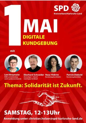 Die Kreis-SPD lädt am Samstag, 1. Mai von 12 bis 13 Uhr zu einer digitalen Mai-Kundgebung zum Thema „Solidarität ist Zukunft“ ein. Als Rednerin konnte die SPD die ehemalige Landesvorsitzende von verdi und aktuelle MdB, Leni Breymaier gewinnen. An der anschließenden Diskussionsrunde werden sich beteiligen Neza Yildirim und Patrick Diebold, beide Bundestagskandidaten, und Eberhard Schneider ehemaliger 1. Bevollmächtigter der IG Metall Bruchsal. Um eine Anmeldung wird gebeten unter christian.holzer@spd-karlsruhe-land.de.